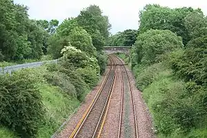 ![]() The site of Livingston station, marked by the overbridge, looking east in July 2007 | |