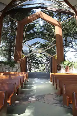 His best-known project is the Wayfarers Chapel, also known as "The Glass Church", an indoor/outdoor structure made almost entirely of glass and built in 1951 for the Swedenborgian church, overlooking the Pacific Ocean on the Palos Verdes Peninsula. The site planning and planting design express his talent and experience as a landscape architect. He had an embracing grove of Redwoods (Sequoia sempervirens) planted to achieve this.[1] The Wayfarer's Chapel is listed in the National Register of Historic Places.[12]