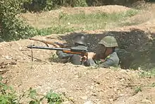 The Leichtes Maschinengewehr Modell 1925 (shortened to Lmg 25)[1] is a Swiss recoil operated light machine gun designed by Colonel Adolf Furrer of Waffenfabrik Bern in the 1920s and produced since 1925 to 1960s.[2] It was the first machine gun in the Swiss Army that could be carried by a man. It takes the 7.5 mm Swiss Service cartridge from a 30-round box magazine and has a cyclic rate of fire of about 500 rounds-per-minute.[3] In 1957, the LMG 25 was replaced by the Stgw 57-Assault rifle.