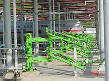 Top loading arms are used to load or unload road or rail tankers. Loading or unloading is done through the manhole on the top of the tanker. Top loading arms can also be used for tight-fill, vapor recovery, marine and other applications when used with specially designed and engineered components, such as vapor plates, tapered hatch plugs, and inflatable hatch seals.[1] Depending on the nature of the product (not dangerous, without any toxic vapors...), the connection may be “open”, this means that the manhole is not sealed. A “Semi-Closed” connection can be made by a cone on the manhole of the tanker. A “Closed” connection is required for all dangerous and toxic products. This connection is made by a flange to the top of the tanker. A cone can be equipped with a vapour hose to prevent the vapors from being released to the atmosphere. Numerous accessories are available to make a loading arm more ergonomic and more effective: press down system, pneumatic up/down system, top level control, safety break valve, purge, drain...etc.