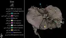 ![]() 1: Right lobe of liver 2: Left lobe of liver 3: Quadrate lobe of liver 4: Round ligament of liver 5: Falciform ligament 6: Caudate lobe of liver 7: Inferior vena cava 8: Common bile duct 9: Hepatic artery 10: Portal vein 11: Cystic duct 12: Common hepatic duct 13: Gallbladder | |