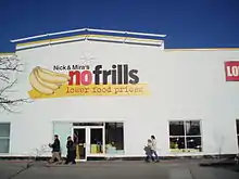 Within months of the No Name launch, Loblaw opened a prototype No Frills store in East York. Also known as a 'box store,' since items were not individually shelved but left in their cardboard shipping cartons, usually with the front cut away, the new store advertised "the lowest overall prices in Toronto." Though customers had to pack their own groceries, bring their own bags or pay 3 cent apiece, and contend with a limited selection of only 500 items, shoppers crowded the store on opening day.[48] Customers gave up other standard conveniences, such as full-service meat or dairy departments, since refrigeration units had been removed to cut costs. In spite of the limited selection and minimal service, the first No Frills store proved a success and within months the company converted two more Loblaws locations to the new deep discount format.[49]