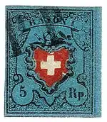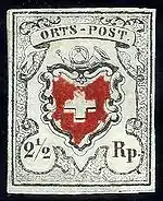 The local mail and rayon stamps of 1850 and 1852 constituted the first series of postage stamps issued by the Swiss Post. In philately, they are among the most sought-after Swiss stamps, with a 5 rappen Rayon I stamp selling for the record price of CHF 348,000 (USD 293,000) at auction in 2008.[1]