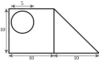This shape is easily divided into a square, triangle, and circle. Note that the circle will have negative area. From the List of centroids, we note the coordinates of the individual centroid. From equation 1 above: