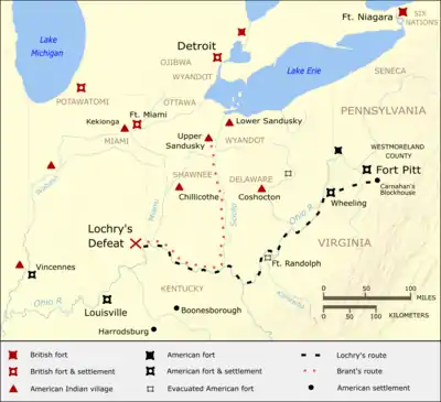 In April, with the New York frontier in ruins, the British transferred Brant to Detroit. The official reason for the move was that Brant was needed to help rally Indian support to counter Clark's anticipated campaign.[34] An apparent unofficial cause was that Brant, who was usually a moderate drinker, had been transferred after getting into a drunken fistfight with an Indian Department officer at Fort Niagara.[35] Although the "Western Indians" of the Ohio Country and Detroit region had strained relations with the Iroquois, they cautiously welcomed Brant's help.[36]