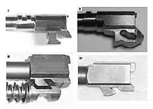 The locked breech systems in handguns and rifle vary significantly. The photograph showing four handgun barrels illustrates the evolution of handgun locked breech systems in four of the most famous firearms. This is from the Browning Hi-Power (I in the photograph), John Browning's last design. The second barrel is of the same action type in the CZ model 75 handgun. The third barrel type is from an HK USP pistol. The fourth barrel is from a Glock (which uses the Sig Sauer system).
