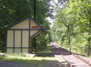 ![]() Locksley station shelter, circa 2010. Pennsylvania Railroad style-signage can be seen adorning the shelter. | |||||||||||||||||||||||