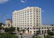 The first twenty years of Edwin F. Greene's presidency was a period of major growth of the company. Lockwood, Greene & Company had established its first branch office in 1899, at Greenville, South Carolina, to serve as the firm's southern office. This was followed by a third office in Chicago in 1911,[4] and in 1912 the southern office was relocated to Atlanta[1] and the Boston office was moved into the new First National Bank Annex at 60 State Street,[lower-alpha 5] taking three full floors of the new building.[6] In 1913 offices were added in Montreal[7] and New York.[8] In 1919, after the close of World War I, offices were added at Cleveland, Detroit and Paris, the latter to manage reconstruction work. In 1920, offices were added at Charlotte and Philadelphia. In 1923, the southern headquarters was moved from Atlanta to Spartanburg, though the Atlanta office was retained.[1]