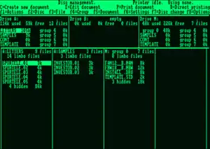 On start-up LocoScript displayed a file management menu,[17] like WordStar but unlike WordPerfect, Microsoft Word and other modern word processors, which start with an empty document.[10] LocoScript enabled users to divide documents into groups, display all the groups on a disk and then the documents in the selected group, and set up a template for each group.[12][17] File names were restricted to the "8.3" format,[18] but the edit facilities enabled users to add summaries up to 90 characters long, which they could display from the file menu.[19] The "limbo file" facility enabled users to recover accidentally deleted documents until the disk ran out of space (there was no hard disk, all files were stored on floppy disks), when the software would permanently delete files from "limbo" to make room for new ones.[20] Journalist Dave Langford published a collection of his articles about the PCW, and titled it "The Limbo Files".[21] LocoScript was designed to accommodate add-on programs, which could be selected via the file manager.[20]