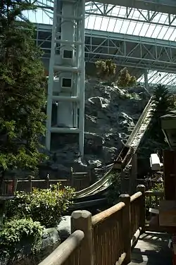 Log Chute, formerly known as Paul Bunyan's Log Chute sometimes Fog Chute for Halloween[1] or Yule Log Chute for Christmas,[2] is a log flume attraction sponsored by Xcel Energy (formerly sponsored by Brawny) at Mall of America's Nickelodeon Universe in Bloomington, Minnesota.[3] It opened on August 11, 1992, and is one of the mall's oldest surviving acquisitions from Knott's Camp Snoopy.[4] The ride is based on the tall tale of Paul Bunyan and is set in a mountain lumber mill featuring two lift hills and two drops as passengers experience singing animatronics, including a 19-foot tall Paul Bunyan (modeled after the Brawny mascot) and Babe the Blue Ox.[5] The attraction was designed to keep riders dry enough so that they could comfortably continue shopping.[6] Holiday overlays for Halloween and Christmas have been put into place since 2017 with the "Fog Chute" and "Yule Log Chute", with the animatronic characters being dressed in festive costumes. For Halloween, Paul has been dressed as a pirate, Jim Hopper from Stranger Things, and Hulk Hogan promoting the short-lived Pastamania restaurant once housed in the mall. A 2022 April Fools Day prank had the attraction become the "Kenny Loggins Chute" with Paul being dressed as the musician.