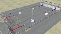 Four towers with cylindrical bases are in the middle of the field. The towers are used in the endgame for alliances to earn up to 30 or more points. To assist teams in driving and programming a robot through an almost completely open field, there is colored tape on the floor to allow for sensor calibration and to create visual reference points. Furthermore, the tape delineates areas where certain robots may or may not traverse.[5]