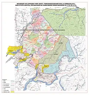 The Lohgarh Sahib Fort (meaning Iron Fort) about 30 kilometres from Sadaura was made by Bhai Lakhi Rai Wanjara under instructions from Guru Hargobind Sahib. Its construction began sometimes in 1620s and was finally completed in 1710.[3] It was made capital of Khalsa kingdom in February 1710 by Banda Singh Bahadur who had earlier captured Samana in 1709 and later also captured Sadaura in Battle of Sadhaura in 1709 after Mughal had declared jihad against the forces of Banda Singh Bahadur. He captured Sirhind on May 12, 1710, after victory in the battle of in the Battle of Chappar Chiri on May 10, 1710.[4] He abolished Zamidari system and gave legal ownership of the land to cultivators. Boundaries of his reign had Sivalik Hills in the north, Yamuna in the east, Tangri river (tributary of Ghaggar river) in the west, and south boundary was Karnal-Thanesar-Kaithal-Samana. After the death of 10th Sikh Guru Guru Gobind Singh at Nanded in 1708, Banda Singh Bahadur left Nanded marched 1700 km across Maharastra and Rajasthan that were in revolt against Mughals and to reach near the forest of Khanda and Sehri (in Kharkhauda Tehsil of Sonepat district of Haryana) a year later in 1709. He established the Khalsa Raj headquartered at Lohgrah fort. The entire treasury acquired in his expeditions, including treasure worth 2 crore won in Sirhind, was deposited here in Lohgarh Sahib. The coins in the name of Guru Nanak and Guru Gobind Singh were minted and issued from here. He was brave in battles. He was brave when executed in Delhi by Mughals. He punished local Mughal chief of Sadaura, Usman Khan, to avenge the killing of Pir Budhan Shah. The historical book, "Twarikh Khasa" chronicles, "Nawab usman Khan of Sadhora was so cruel and fanatical that he used to have cows slaughtered and uneatable parts of cows he would have them thrown into the Hindus homes. He never allowed them to cremate their dead and forcibly matched Hindu brides to Musalmen. The Jazia was collected in most humiliating ways so that they might be more easily converted to Islam."