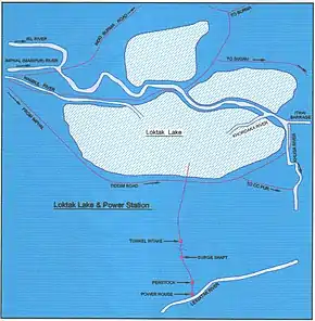 The Loktak Hydropower Project on the Manipur River or Imphal River, with the Loktak Lake forming the head waters to provide regulated storage for power generation, was built in 1983 as a multipurpose project with power generation of 105 MW (3x35 MW) for power supply to Manipur, Nagaland, Assam, Mizoram, Arunachal Pradesh, Meghalaya and Tripura, and lift irrigation to an area of 23,000 ha (57,000 acres) in the Manipur valley. The main components of the project, as built, are, a) the Ithai Barrage, across the Manipur river of 10.7 m (35.1 ft) height and 58.8 m (192.9 ft) length with three spillway bays, b) water conductor system for trans-basin diversion comprising an open channel of 2.323 km (1.443 mi) length, a cut and cover section of 1.077 km (0.669 mi) length (bed width 18 m (59 ft), followed by a Head Race Tunnel of 3.81 m (12.5 ft) diameter (horseshoe type) and 6.62 km (4.11 mi) long to carry a discharge of 58.8 m3/s (2,080 cu ft/s) (42 m3/s (1,500 cu ft/s)) for power generation and 16.8 m3/s (590 cu ft/s) for irrigation), c) a surge shaft, d) penstocks and e) a surface powerhouse and a tailrace channel on the right bank of the narrow Leimatak River with three units of 35 MW capacity each generating an annual energy of 448 GW·h (1.613 PJ).[14] The downstream Loktak Power Project in cascade to utilize the regulated releases from the upper project for further power generation of 90 MW is proposed to be taken up for joint implementation by NHPC and the Government of Manipur.[15] The project has invited severe criticism since the water level in the lake at the Ithai barrage is maintained throughout the year at FRL 786.5 m (2,580 ft) from considerations of power generation from the well planned water conductor system. The problem in the lake is, however, diverse; economic activities in and around the lake, and encroachments by 50,400 fishermen for extensive fishing activity are also cited to be some reasons. Other reasons for the distress situation in the lake are a) jhum (shifting) cultivation, b) extensive deforestation and unscientific land use practices in the catchment areas which bring large amount of silt into the lake and c) undefined ownership of the lake where the stakeholders are the districts of Imphal west district, Bishnupur and Thoubal causing lack of integrated approach to the lakes potential for providing benefits.[9]