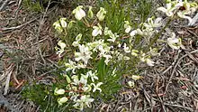 Lomatia tinctoria grows as a woody shrub reaching 1.5 m (5 ft) high, or rarely up to 2 m (7 ft) high.[2] The leaves are strongly lobed (pinnate or bipinnate) and are around 8 cm long. The white or cream flower heads, known as inflorescences, appear in summer.[3]