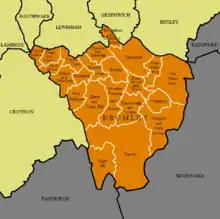 The borough is the largest in Greater London by area and occupies 59 square miles (153 km2). The majority of the borough is Metropolitan Green Belt, including nearly all of the land south of the A232-A21 route between West Wickham and Pratt's Bottom.[2] Consequently, it is also perhaps the most rural borough and contains more of the North Downs than any other, as that escarpment is broad between Bromley and Banstead. This is also reflected in its population density, which is the lowest of the 32 London boroughs.[3]