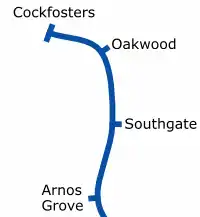 Enfield is served by the Piccadilly line of the London Underground with stations at Arnos Grove, Southgate, Oakwood (named as Enfield West when it first opened) and Cockfosters (where the line terminates). Suburban London Overground and National Rail Great Northern services also run within the borough.