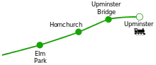 The District line of the London Underground runs roughly east–west through the middle of the borough and there is an extensive network of London Bus routes, linking all districts to Romford and other places beyond the borough.[14] The London, Tilbury and Southend line (operated by c2c) passes through the borough in two places and the Great Eastern Main Line (operated by TfL Rail and Abellio Greater Anglia) passes through the north of the borough serving Romford, Gidea Park and Harold Wood. There is also a branch line from Romford to Upminster which is currently operated by London Overground. There are proposals for transport improvements in the south of the borough where the population is expected to rise.