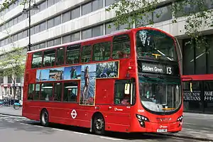 When re-tendered, route 13 was retained by London Sovereign with a new contract commencing on 31 August 2013. Wright Eclipse Gemini 2 bodied Volvo B5LHs were introduced on the same date.[9][10] In March 2015, Transport for London opened a public consultation on proposals to scrap the route.[11][12] The route was saved after intervention by Mayor of London Boris Johnson.[13][14] In September 2016, six Wright SRM bodied Volvo B5LHs entered service on the route.[15][16][17] In July 2016, under the tenure of new Mayor of London Sadiq Khan, TfL opened another consultation on proposals to extend the route to North Finchley and divert it to Victoria station replacing route 82.[18][19][20] This took effect on 1 April 2017 with it now being operated by Tower Transit and becoming a 24-hour route.[21][22]