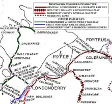 The L&CR struggled with financial difficulties and from 1861 leased their line to the growing Belfast & Northern Counties Railway (BNCR).[5] This saw the closure of Coleraine Waterside Station with services from Derry running into the BNCR station in Coleraine on the other side of the river. Eventually the BNCR agreed to buyout the L&CR completely in 1871, ending the line's existence as an independent company.[6][5] This was not the end of the railway as it would continue to form part of the mainline between Belfast and Londonderry for the BNCR and its successors. The BNCR invested in the line and constructed a new terminus in Londonderry in 1874, which despite being abandoned in favour of a smaller terminus between 1980-2019 is still in use today.