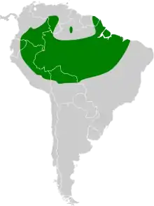 It is found in the Amazon Basin of Brazil, and Amazonian Colombia, Ecuador, Peru, and Bolivia; also the middle and upper Orinoco River Basin of Venezuela. It is also found in most of Guianan French Guiana bordering the northeast Amazon Basin and Brazilian state Amapá. Its natural habitats are subtropical or tropical moist lowland forest and subtropical or tropical swamps.