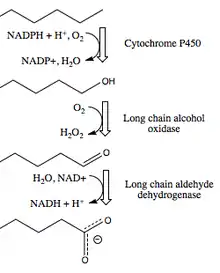 The long-chain alcohol is then oxidized by long-chain fatty aldehyde dehydrogenase to a carboxylic acid, also producing NADH from NAD+. Fatty acids can be oxidized again to make dicarboxylic species that join with coenzyme A and enter the beta oxidation pathway in the peroxisome.[5]