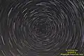 A star trail photograph showing the apparent motion of stars around the north celestial pole; Polaris is the bright star near the pole, just above the jet trail.