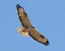 In flight, the long-legged buzzards appears as a mid-sized rather broad-bodied raptor. Possessing an almost eagle-like silhouette, it tends to appear with a protruding head with a somewhat heavy bill, long broad wings with fairly straight edges and only slightly tapering hands with rounded five-fingered end. It is relatively long-tailed with the tail having a fairly rounded shape. Juveniles tend to be slimmer looking with narrower wings and more S-shaped trailing edges as well as a somewhat longer tail. Long-legged buzzards tend to fly with comparatively slow, deep beats and to have a relatively slow flight. The species glides with their arms raised and hands more level, wings noticeably kinked at carpals and soars in wide circles with the wings in shallow dihedral. The upward bent tips can enhance their eagle-like appearance. Long-legged buzzards often hover frequently and for extended periods.[3][6] In the flight, the whitish based orangey tail often looks all white at a distance and to stand out in its paleness against the dark rear body and the rear wings. The primary coverts and many greater coverts are blackish in adult long-legged buzzards with the greater coverts pale tipped. Adults are dark grey on the flight feathers with blackish bars radiating outwards on wingtips and on the trailing edges. The underwing coverts are usually lightly streaked with rufous in pale adults, while intermediate adult has a stronger contrast from pale head and breast to darker, browner upperbody and wing coverts, breast and wing linings. The flying rufous adult tends to look more uniform above with colours varying from ochre to tawny to darker rufous brown and to possess richer coloured darker parts, with the tail very variable in rufous morph.[3][7] Dark adult in flight may appear with or without a pale nape patch. Dark morph long-legged buzzards above evidence pale bases to primaries, some less dark individuals showing slight contrast of brown-tinged wing coverts against blacker carpal areas with grayish cast to secondaries but tail more obviously pale and greyer and variable. Below dark morph adult striking contrasting from dark body and underwing coverts against pale flight feathers.[3] Juvenile long-legged buzzards are evidently more streaky in pale, intermediate and rufous morphs with differing wing shape. Juveniles of the 3 morphs have comparatively uniform secondaries above with a paler based hand, the inner four primaries being thinly barred, the whitish tail becoming greyer brown and appear indistinctly barred distally. The trailing wing edges are more diffuse, greyer and narrower than on adults with a dark line often evidence along greater coverts. Dark morph juveniles in flight even more uniform above without darker trailing edges above and below greyish secondaries are much duskier-looking with broader but diffuse barring and often markedly wide trailing edges, this increasing the contrast against the dark tipped whitish hand.[3][6][7]