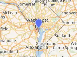 The first bridge at this location was the "Washington Bridge", a wooden toll bridge. The Washington Bridge Company was authorized on February 5, 1808 by the District Commissioners and an Act of Congress with the purpose of shortening the distance in the country's main mail route.[3][4] President Thomas Jefferson signed it into law soon after. It was built to provide foot, horse and stagecoach traffic to Washington City.[5] It was the second bridge to cross the Potomac in the District of Columbia, following a 1797 span at a narrower crossing near Little Falls, upstream of Georgetown, at the site of the present Chain Bridge. At the time it opened, and in official documents, it was referred to as Washington Bridge, Potomac Bridge or simply "the Bridge" but by the 1830s it began to be called the "long Bridge across the Potomac" to distinguish it from the bridge near Little Falls.[6][7] Over time, the colloquial name was shortened to just "Long Bridge".