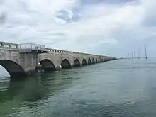 The Long Key Bridge, officially known as the Dante B. Fascell Bridge, is a bridge in the Florida Keys connecting Long Key and Conch Key, roughly halfway between Miami and Key West. At a length of nearly two and a half miles, it is the second longest bridge on the Overseas Highway after the Seven Mile Bridge.[1][2] The current bridge opened in 1982, replacing the parallel Long Key Viaduct, which carried the Overseas Railroad from 1907 to 1935 and was repurposed for highway use shortly after.