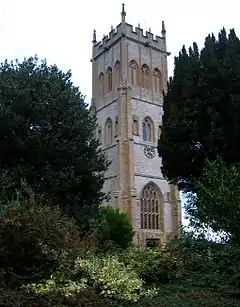 Holy Trinity church dates from 1493. An earlier church would have stood on this site from the 9th century or earlier. The current church was built of local lias stone cut and squared, with hamstone dressings. It has stone slate roofs between stepped coped gabled with finials to the chancel and north porch. Internally, the chancel has a ceiled wagon-roof, with moulded ribs and plaster panels. The tower exhibits the tracery typical of Somerset towers. The under-tower space has a lierne vault, and a 15th-century octagonal font with quatrefoil panels. The building has been designated by English Heritage as a Grade I listed building.[14] The tower has a ring of six bells, the tenor weighing 136 stone (864 kg).[15]