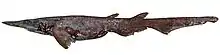 The longhead catshark or smoothbelly catshark (Apristurus longicephalus) is a species of catshark, family Scyliorhinidae, with a patchy distribution in the Indo-Pacific from Mozambique to southern Japan to northern Australia. It is found in water between 500 and 1,140 m (1,640 and 3,740 ft) deep. This species grows to 59 cm (23 in) long and is characterized by its extremely long and narrow snout, short abdomen, and long anal and caudal fins. In addition, a large area of the anterior ventral portion of its body lacks dermal denticles. The longhead catshark is oviparous and the only known cartilaginous fish that is normally hermaphroditic, with the majority of individuals having both the functional reproductive organs of one sex and the undeveloped reproductive organs of the opposite sex.