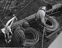 Longline fishing, or longlining, is a commercial fishing angling technique that uses a long main line with baited hooks attached at intervals via short branch lines called snoods or gangions.[1] A snood is attached to the main line using a clip or swivel, with the hook at the other end. Longlines are classified mainly by where they are placed in the water column. This can be at the surface or at the bottom. Lines can also be set by means of an anchor, or left to drift. Hundreds or even thousands of baited hooks can hang from a single line. Longliners – fishing vessels rigged for longlining – commonly target swordfish, tuna, halibut, sablefish and many other species.[2]