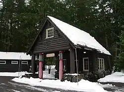 Individually listed structures on the National Register include the Longmire Buildings, a National Historic Landmark comprising the park's former headquarters, the Longmire Cabin, and three comfort stations, L-302, L-303 and L-304. The district was placed on the National Register of Historic Places on March 13, 1991.[1] Longmire is also the location of Mount Rainier's National Park Inn, the Longmire Museum. These buildings are constructed in rustic style.[4] The National Park Inn is the only accommodation in the park open all year round.[5] The Longmire Historic District is in turn part of the Mount Rainier National Historic Landmark District, which encompasses the entire park and which recognizes the park's inventory of Park Service-designed rustic architecture.[1]