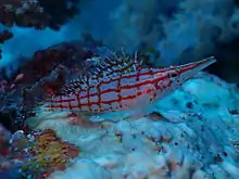 The longnose hawkfish (Oxycirrhites typus) is a species of marine ray-finned fish, a hawkfish belonging to the family Cirrhitidae. It is found on tropical reefs of the Indian Ocean and the Pacific Ocean, where it can be found at depths around 10 to 100 m (33 to 328 ft). It prefers the steep outer slopes of the reefs amongst gorgonians and black corals. This species can reach 13 cm (5.1 in) in total length. It can also be found in the aquarium trade. It is currently the only known member in its genus.[2]