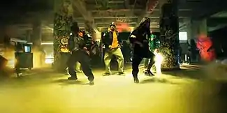 The video begins with scenes of Brown wearing a mirrored mask inside a giant birdcage, before switching to a dance routine in a smoke-filled, graffiti-covered parking garage. The mask was created for Brown by producer-collaborator Nick Marsh. In between these scenes, the video shows a Step Up-type dance-off in the parking garage.[17] When Brown raps his verse, he is seen standing next to Rhymes, wearing horn-rimmed glasses, a red Brooklyn cap, and a white baseball jersey, which was the signature look of Mars Blackmon from the 1986 film, She's Gotta Have It.[16] Rhymes then raps his verse after Brown's, standing beside him and later on the stairs in the parking garage. Wayne's verse soon follows after, with scenes of him rapping in front of the DeLorean sports car, and also on top of an ambulance car. The video also features cameo appearance from Kevin McCall, Diplo, Birdman and Mack Maine. Birdman and Maine appear when Lil Wayne is performing his verse.