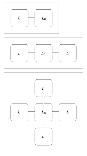 Multi-loop, multi-gap LGRs have also been developed. The simplest of these is the two-loop, one-gap LGR. In this case, magnetic field lines form closed loops by passing through each of the bores of the LGR and the currents on the inner walls propagate in opposite directions - clockwise in one bore and counterclockwise in the other. The equivalent circuit, neglecting losses, is a parallel combination of inductors and in series with capacitance . If , then the resonant frequency of the two-loop, one-gap LGR is times greater than that of the conventional one-loop, one-gap LGR having the same bore and gap dimensions. It is also worth noting that, since magnetic field lines pass from one bore to the other, radiative power losses are strongly suppressed and the resonator maintains a high quality factor without requiring additional electromagnetic shielding.[10] [13]