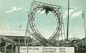 Loop the Loop was designed in 1904 by engineer and inventor Lina Beecher who was a supervisor at the American Railway Company. Beecher had previously designed the wooden Flip Flap Railway at Paul Boyton's Sea Lion Park on Coney Island, New York, but that coaster's circular loop produced excessive g-forces on its riders.[1] Adapting the steel construction and teardrop-shaped loop pioneered by Edwin Prescott (builder of Loop the Loop roller coasters on Coney Island and Atlantic City), Beecher constructed the Loop the Loop at Olentangy Park.[2] The coaster sat near the park's dancing pavilion.[3] The ride was a failure, however, and it was removed shortly thereafter.[2]