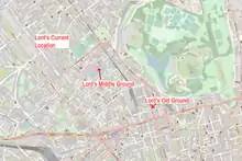 Acting on behalf of members of the White Conduit Club and backed against any losses by George Finch, 9th Earl of Winchilsea and Colonel Charles Lennox, Thomas Lord opened his first ground in May 1787 on the site where Dorset Square now stands, on land leased from the Portman Estate.[7] The White Conduit moved there from Islington, unhappy at the standard of the ground at White Conduit Fields, soon afterwards and reconstituted themselves as Marylebone Cricket Club (MCC). It was thought that the establishment of a new ground would offer more exclusivity to its members, with White Conduit Fields considered too far away from fashionable Oxford Street and the West End.[8] The first match played at the new ground saw Middlesex play Essex.[9][10] In 1811, feeling obliged to relocate because of a rise in rent, Lord removed his turf and relaid it at his second ground. This was short-lived because it lay on the route decided by Parliament for the Regent's Canal, in addition to the ground being unpopular with patrons.[10][9]