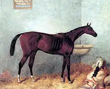 Lord Lyon was foaled in 1863 at Oakley Hall, the stud farm of General Mark Pearson which was located twenty miles outside of Oakham in Northamptonshire.[2] He was sired by Stockwell, winner of the 1852 St. Leger and 2,000 Guineas Stakes and a seven-time leading sire. Lord Lyon's dam, Paradigm, was not "fashionably bred" being sired by Paragone, a "3-guinea" sire noted more for producing hunt horses than racehorses.[3] Paradigm's dam, Ellen Horne, was purchased by Pearson for around 18 guineas for his wife to use as a hack horse.[4] Paradigm was an unsuccessful racehorse, running only twice and placing in the Lavender Stakes as a two-year-old before she fractured pastern while running in the Bentinck Memorial at Goodwood[5] forcing her retirement from racing.[6] Like her dam, Paradigm was also used as a hack before she entered the stud.[3] Paradigm was later heralded as a worthy broodmare. In 1864, she foaled Lord Lyon's full sister, Achievement, which won the 1867 St. Leger, Doncaster Stakes and Coronation Cup among many other races. Another full-sister, Chevisaunce, was the dam of the Epsom Oaks and St. Leger winning filly Jannette.[7] Paradigm produced a total of 13 foals and also produced King at Arms, Man at Arms and Blue Mantle.[6]