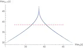 In Figure 4 of his paper,[1] Lorenz plotted the relative maximum value in the z direction achieved by the system against the previous relative maximum in the z direction. This procedure later became known as a Lorenz map (not to be confused with a Poincaré plot, which plots the intersections of a trajectory with a prescribed surface). The resulting plot has a shape very similar to the tent map. Lorenz also found that when the maximum z value is above a certain cut-off, the system will switch to the next lobe. Combining this with the chaos known to be exhibited by the tent map, he showed that the system switches between the two lobes chaotically.