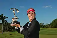 Lorie Kane, CM (born December 19, 1964 in Charlottetown, Prince Edward Island, Canada) is a professional golfer on the LPGA Tour. She began her career on the LPGA Tour in 1996 and has four career victories and 99 top-10 finishes on the tour. She won the Bobbie Rosenfeld Award in 2000 and became a member of the Order of Canada at a ceremony in December 2006.[1][2] Kane was the second Canadian to have multiple wins on the LPGA circuit in one season, in 2000, after Sandra Post performed the feat twice, in 1978 and 1979. The next person to do so was Brooke Henderson, in 2016.[3] In 2016, she was inducted into the Canadian Golf Hall of Fame. In May 2020 it was announced that she would be inducted into Canada's Sports Hall of Fame as part of the class of 2020-2021.[4]