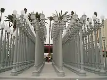 Surrounding the BCAM building and LACMA's courtyard is a 100 palm tree garden, designed by artist Robert Irwin and landscape architect Paul Comstock. Some of the 30 varieties of palms are in the ground, but most are in large wooden boxes above ground.[71][72] Directly in front of the new entrance to LACMA on Wilshire Boulevard, where Ogden Drive once bisected the 20-acre campus between Wilshire Boulevard and 6th Street, is Chris Burden's Urban Light (2008), an orderly, multi-tiered installation of 202 antique cast-iron street lights from various cities in and around the Los Angeles area. The street lights are functional, turn on in the evening, and are powered by solar panels on the roof of the BP Grand Entrance.