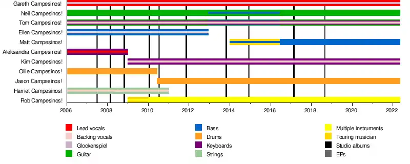Los Campesinos! are a seven-piece indie pop band from Cardiff, Wales, formed in early 2006 at Cardiff University. Though the band formed in Wales, none of the members are Welsh. The band has gone through several lineup changes during their career, with their current lineup consisting of Gareth Paisey (lead vocals, lyrics), Neil Turner (guitar), Tom Bromley (guitar), Rob Taylor (guitar, other instruments), Kim Paisey (keyboards, vocals), Matt Fidler (bass) and Jason Adelinia (drums); the members replace their surnames with "Campesinos" as stage names. Paisey, Turner and Bromley are the only remaining original members still in the band.