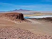 Salar de Pujsa is a salt flat located southwest of Salar de Tara, 83 kilometers from San Pedro de Atacama, and northeast of Acamarachi volcano. With a maximum altitude of 4,585 metres above sea level, Pujsa is considered the most isolated section in the reserve. The salt flat receives the waters of the Quepiaco and Alitar creeks and was listed as a Ramsar site in 2009.[11] Birds that migrate across the hemispheres use the salt flat and surrounding land as a staging area, including the Wilson's phalarope.[11]