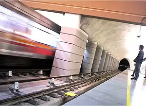 Like in Plaza Egaña, there are columns between the two tracks that support a double barrel vaulted ceiling. The station has platforms 140 m (460 ft) in length.[3]