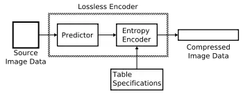 JPEG-LS is a lossless/near-lossless compression standard for continuous-tone images.[6] Its official designation is ISO-14495-1/ITU-T.87.[7] It is a simple and efficient baseline algorithm which consists of two independent and distinct stages called modeling and encoding. JPEG-LS was developed with the aim of providing a low-complexity lossless and near-lossless image compression standard that could offer better compression efficiency than lossless JPEG. It was developed because at the time, the Huffman coding-based JPEG lossless standard and other standards were limited in their compression performance. Total decorrelation cannot be achieved by first order entropy of the prediction residuals employed by these inferior standards. JPEG-LS, on the other hand, can obtain good decorrelation.[8][9] Part 1 of this standard was finalized in 1999. Part 2, released in 2003, introduced extensions such as arithmetic coding. The core of JPEG-LS is based on the LOCO-I algorithm,[10] that relies on prediction, residual modeling and context-based coding of the residuals. Most of the low complexity of this technique comes from the assumption that prediction residuals follow a two-sided geometric distribution (also called a discrete Laplace distribution) and from the use of Golomb-like codes, which are known to be approximately optimal for geometric distributions. Besides lossless compression, JPEG-LS also provides a lossy mode ("near-lossless") where the maximum absolute error can be controlled by the encoder.