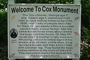 During the morning of April 24, 1856, Samuel Cox heard his dog barking in the forest and thought that it must have treed a squirrel. Samuel retrieved his rifle and headed into the woods. It is thought that while Samuel was gone, the boys must have strayed from home to follow their father. Susannah thought that Samuel had taken the boys with him. It was only when Samuel returned without them that they realized their children were gone.[2] They called for the boys but received no replies. Samuel went for help from his nearest neighbors and by that evening more than one hundred men were searching for the children. Fires were lit in the forest in the hope that the boys would see one and approach. Nearly a thousand people showed up to search the next day. A nearby stream, Bob's Creek, was surging with spring snow melt and it was thought that there was no way the boys could have crossed to the other side without drowning. A search of the creek was performed but the boys were not found.[3]