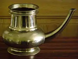 A lota (Hindi: लोटा, Odia: ଲୋଟା/ନୋଟା, Urdu: لوٹا) is a type of spouted globular (round), small-sized vessel made of brass, copper or plastic used in the Indian subcontinent[1] since at least the 2nd millennium BC.[2] In Dharmic religions, the copper lota has a sacred usage, such as in a yagna ritual during puja prayers, weddings and other sacred ceremonies.[3] According to the ancient Indian/Hindu-origin traditional medicine system of ayurveda, drinking water stored in the copper lota has health and nutritional benefits.[4]