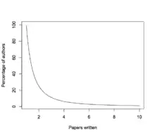 Lotka's law,[1] named after Alfred J. Lotka, is one of a variety of special applications of Zipf's law. It describes the frequency of publication by authors in any given field. It states that the number of authors making contributions in a given period is a fraction of the number making a single contribution, following the formula where nearly always equals two, i.e., an approximate inverse-square law, where the number of authors publishing a certain number of articles is a fixed ratio to the number of authors publishing a single article. As the number of articles published increases, authors producing that many publications become less frequent. There are 1/4 as many authors publishing two articles within a specified time period as there are single-publication authors, 1/9 as many publishing three articles, 1/16 as many publishing four articles, etc. Though the law itself covers many disciplines, the actual ratios involved (as a function of 'a') are discipline-specific.
