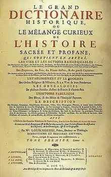 Moréri's encyclopedia, Le Grand Dictionaire historique, ou le mélange curieux de l'histoire sacrée et profane (literally, The Great Historical Dictionary, or Curious Anthology of Sacred and Secular History, although it was translated differently into English at the time) was first published in Lyon in 1674. The encyclopedia focused almost exclusively on historical and biographical articles. Moréri dedicated it to Gaillard de Longjumeau, the Bishop of Apt, to whom he had been appointed chaplain. Moréri's one-volume edition of 1674 and posthumous two-volume edition of 1681 were revised and expanded by others after his death. At least twenty-four editions were published between 1674 (one volume) and 1759 (ten volumes). The encyclopedia was also translated and adapted into English, German, Dutch and Spanish.[4]